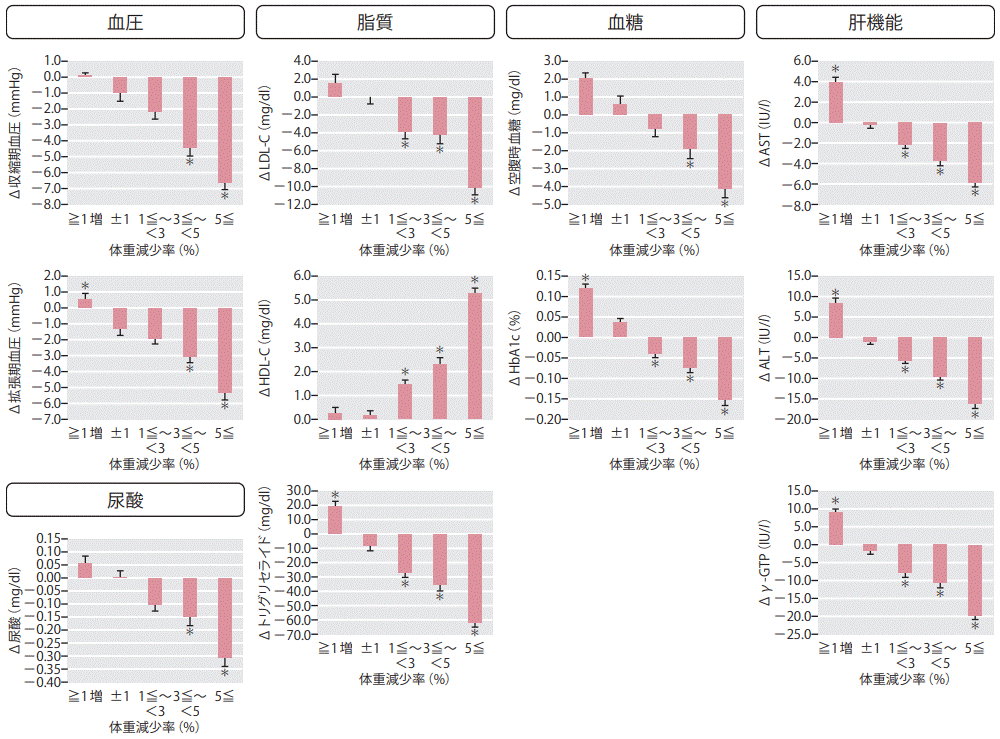 2008年から開始された特定健診・特定保健指導のデータの結果、体重の1~3%減量でLDLコレステロール、HDLコレステロール、中性脂肪、HbA1c,肝機能は改善し,3~5%の減量で血圧,尿酸,空腹時血糖が改善したという結果になります。