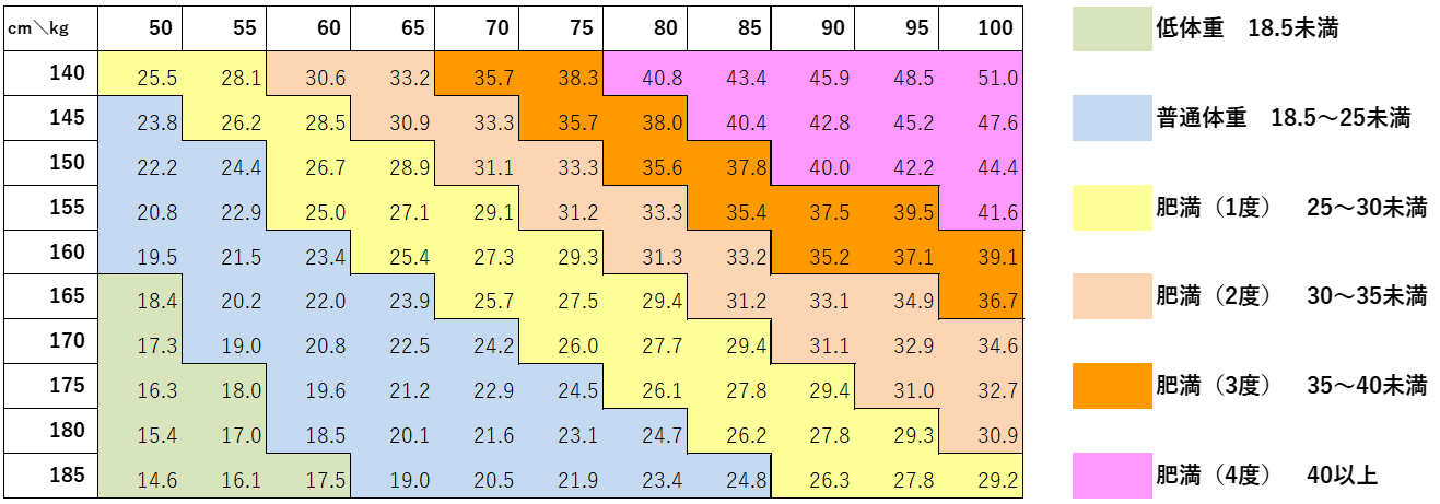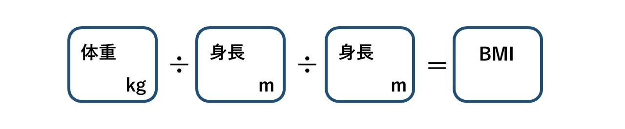 - 【例】体重55㎏、身長160㎝の人の場合、55÷1.6÷1.6=21.4